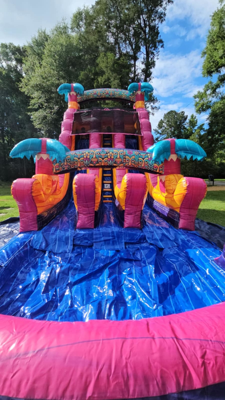 We take pride in offering exceptional customer service with our main service + 18ft Teal Rippling Rush in delivery areas. Our team ensures timely delivery, complete setup, and thorough safety checks before your event begins. We serve a wide range of local areas, making sure your party goes off without a hitch!