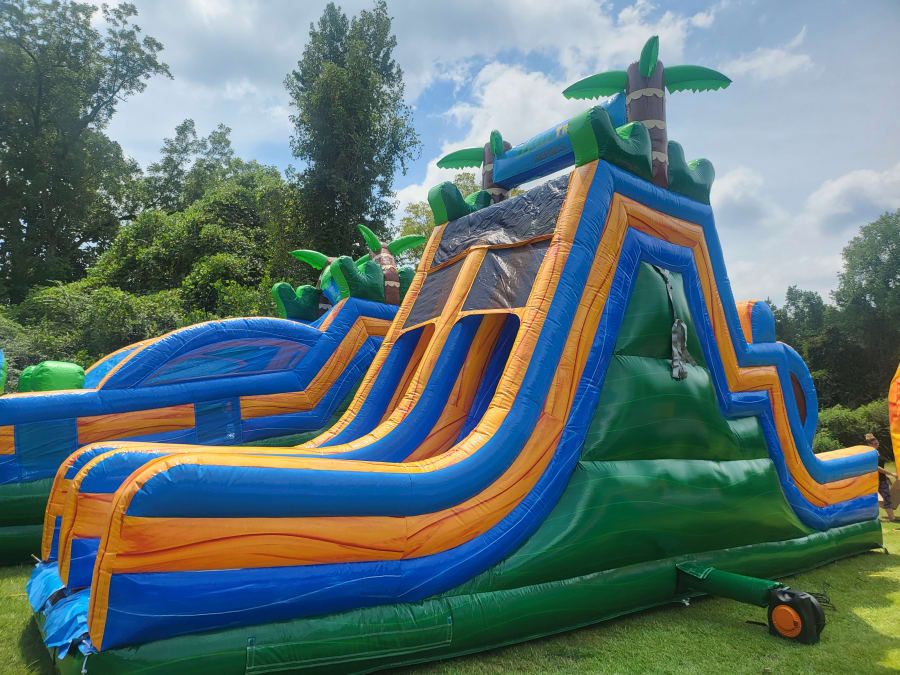 The 34-foot Warped Wall is a fun filled obstacle 17-foot slide! Run up the ramp and pull yourself up to a rock wall leading to a steep drop on the double lane slide! Fun for all age groups!