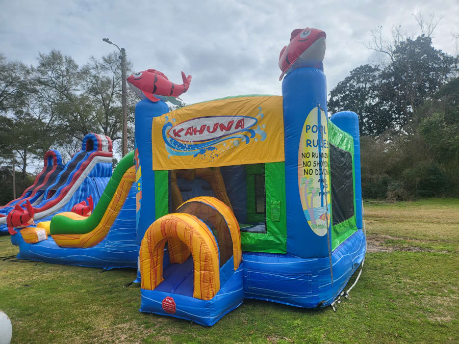 The Kahuna Combo is a double lane combination of a 13X13 bounce house and a double lane water slide. This combo is perfect for children 8 and under! The kids can jump until their heart desires and then cool off with the dual water slide with an inflated pool of water!